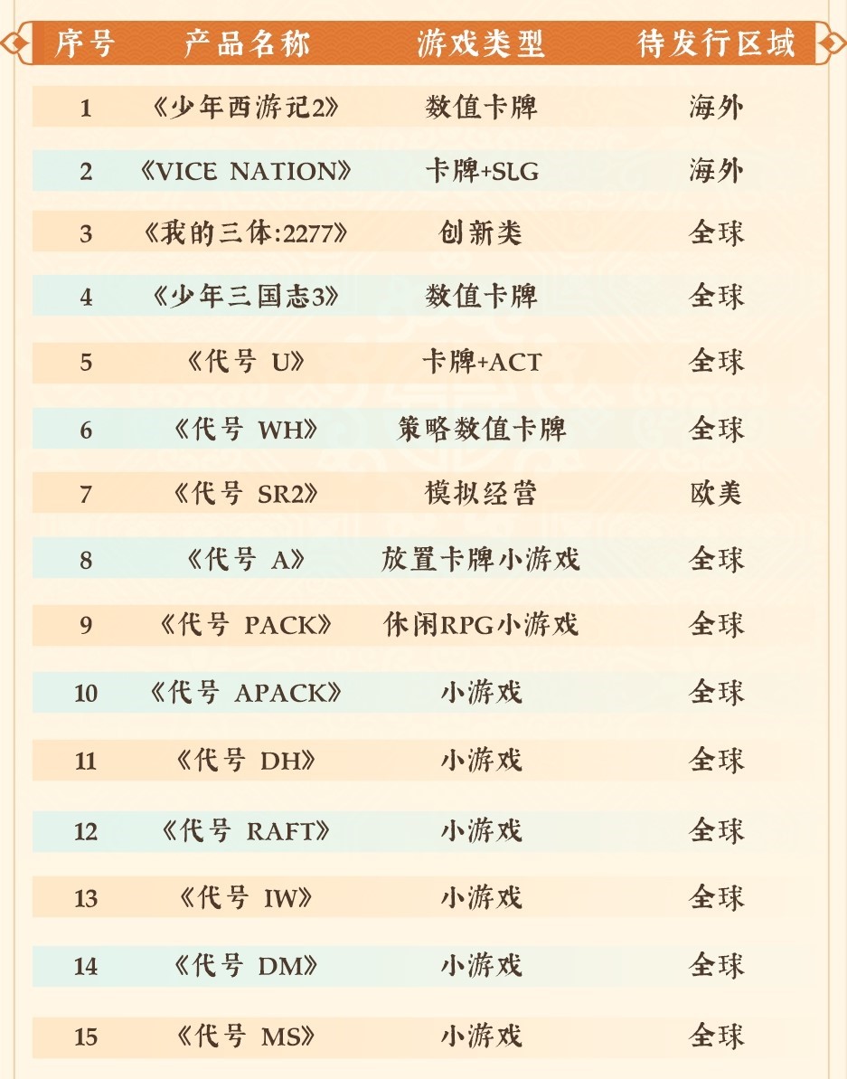 首款《三体》IP正版授权游戏《我的三体::2277》已开放预约,,,,另有现代都市题材SLG《Vice Nation》、、、、少年系列重磅新品《少年三国志3》、、、模拟经营全平台游戏《代号::SR2》等产品储备。。此外在小游戏赛道上,,,《代号 A》《代号 Pack》《代号 DH》等也将陆续开启测试,,伴随多款新品的陆续上线有望进一步撬动增长空间。。。