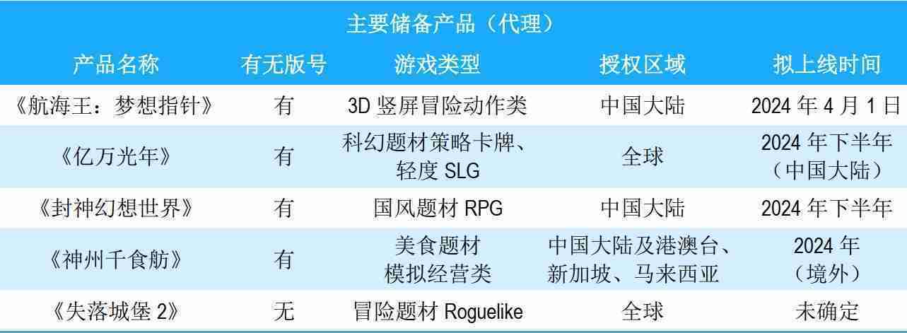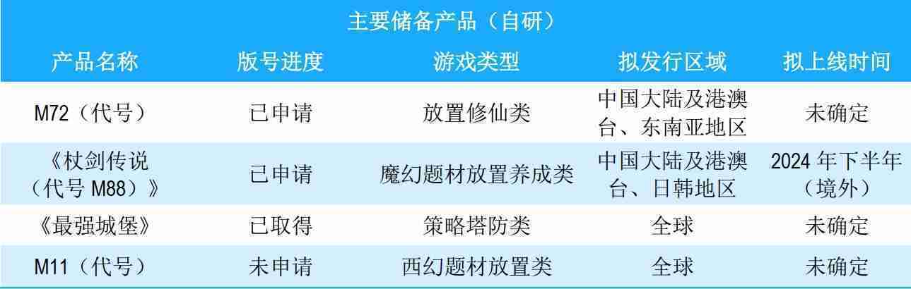 公司储备的多个自研、、、代理产品都在有序推进当中,,涵盖放置类、、、、策略类、、、模拟经营类、、RPG、、、、Roguelike等多元化游戏品类,,,,储备的主要自研和代理产品如下::